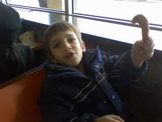 At the moment, he's chowing down on a pretzel. We'll eat, get our provisions, and then we'll get him a pickle. It's what he's into.