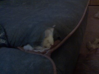 All of this culminated early this morning in the latest damage: a hole in our den couch. Sophie has chewed through a laptop power cord — not great, but not irreplacable. The hole in the couch, however, is a major problem. Our couches are an unusual green with tan piping and a pillow top attached to the main cushion. We can’t just sew it and turn the cushion around or over; we have to get it repaired and/or live with the obvious damage. Who knows what it will cost (laptop cord was $100), but it is money that we do not have.