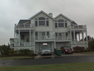 After 10 and a half hours in the car, with my leg cramping and my neck hurting, and the rain falling like an incessant, yammering fool, we half docked in our port for the week, this lovely, three-story, eight-bedroom house in the Buck Island development in Corolla, NC.