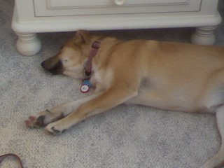 Rosie's asleep on the floor — I hate to wake her so we can go to the beach. It's not swimming weather, but the sun is up, I have a good book (Nixonland by Rick Perlstein) and two 20-foot leashes so the dogs can head into the ocean without us joining them in the chilly water.