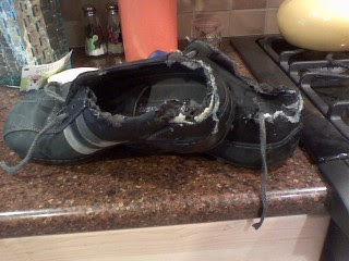 This picture speaks for itself, though I think a little background on how these Skechers became scrap is useful.