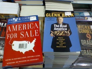 There is something more than a little troubling about books like the ones pictures, by Glenn Beck and Jerome Corsi and Michelle Malkin, that equate liberalism with treason. It's one thing to disagree — Ross Douthat and George Will, who I find off base most of the time, at least engage in debate — but it's another to transform philosophical arguments into concpiracy, which does nothing more than degrade the public discourse. That these treason tracts are the only political books — aside from the Kennedy memoir — available at the big box store we're shopping at today makes me just a bit sad.
