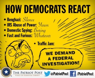 The message is pretty clear. Here are four major scandals (at least as defined by Fox News) that met with silence from “Democrats,” which is supposed to cover a rather large and amorphous entity that includes not only the Obama administration, but members of Congress and the Senate and the media. The one scandal under investigation? A “Traffic Jam” – a phrase designed to make light of the abuses under investigation.