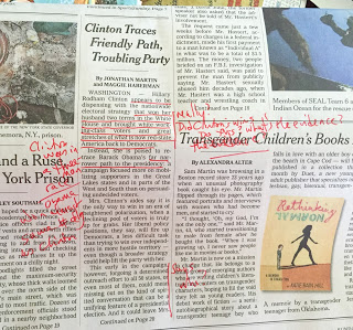Let’s look at the first four paragaphs (see the photo above of my red-penned mark-up). It starts with a conditional claim, that Clinton “appears to be dispensing with” with Bill Clinton’s approach — a phrase designed to distance the story from its main thesis, that Hillary Clinton has decided that she can’t win “white working-class voters and great stretches of what is now red-state America” and that, in doing so, she will be foregoing an opportunity to use her campaign to unite voters and politicians. This assumes, of course, that Bill Clinton was a unifying figure in American politics — a rather absurd claim given that the Democrats lost the House for the first time in 40 or so years while he was in office, and that the ’90s were marked by the same kind of partisan gamesmanship we have been witnessing during the Obama era.