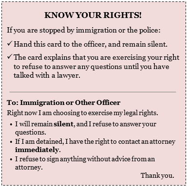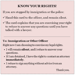 I’ve been asked about this so I thought I would share it here. Even if you are undocumented, you have rights when you are approached by police, immigration or border control agents. The National Immigration Law Center offers this guidance:
