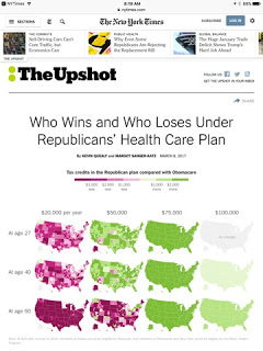 The New York Times has a useful set of maps today that graphically demonstrate the economic impact that the Republican healthcare plan will have on individuals in various regions of the nation. Supporters are touting the plan as a better and more efficient way to provide coverage. It “use(s) refundable tax credits to help people buy their health insurance,” which also was a feature of the Affordable Care Act. The ACA — i.e., Obamacare, included a variety of other sticks and carrots to expand risk pools and coverage, someof which is being dismantled by the Republicans, who also have changed the way the tax credits will work. Because of this, the plan is going to cost low-income Americans more while saving upper-middle class people money.