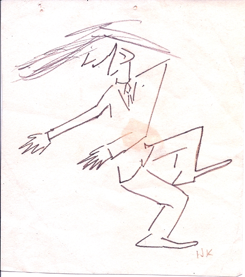 and he began rocking fast, his left foot jumped up with every beat, his neck began to rock crookedly, he brought his face down to the keys, he pushed his hair back, his combed hair dissolved, he began to sweat. The music picked up. The bass-player hunched over and socked it in, faster and faster, it seemed faster and faster, that’s all.