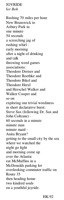 The speed, the way the towns exist in name only, as highway signs, the night, the talking — this is the romance of the novel, it’s magnetic allure. I remember drinking tequila and smoking dope one night with my pal Bob in the house we rented. It was a night of big conversation, as every night was. We were 20, unformed, gazing ahead, and sometime deep in the night we decided to head to Asbury Park, racing east on the highway, doing 70, 80, arriving in the decaying Shore town made famous by my idol, Bruce Springsteen, hitting a McDonald’s for breakfast, realizing we had no cash, fleeing without our food, and racing home in the same burst of energy and youthful exuberance that had us up all night in the first place. This is what 20-year-olds do — or did, or maybe it was just us. We lived that way, alternating between the frenzy, partying at night, and the doldrums (to borrow a word from Ginsberg), working boring day jobs and doing the things you need to do to survive. And we read and wrote and played our music loudly, and “tried to walk like the heroes we thought we had to be” (Springsteen, “Backstreets”).