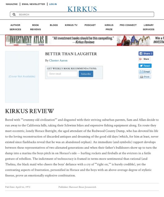 I was tooling around the web and started playing with search terms and different combinations that included the words “runaways,” “brothers,” “junkyard,” and “Horace.” I added “YA,” for young adult, which is the new fiction craze. And there it was. The book was called Better than Laughter. It was by Chester Aaron, a largely forgotten but prolific writer of both YA and adult fiction.
