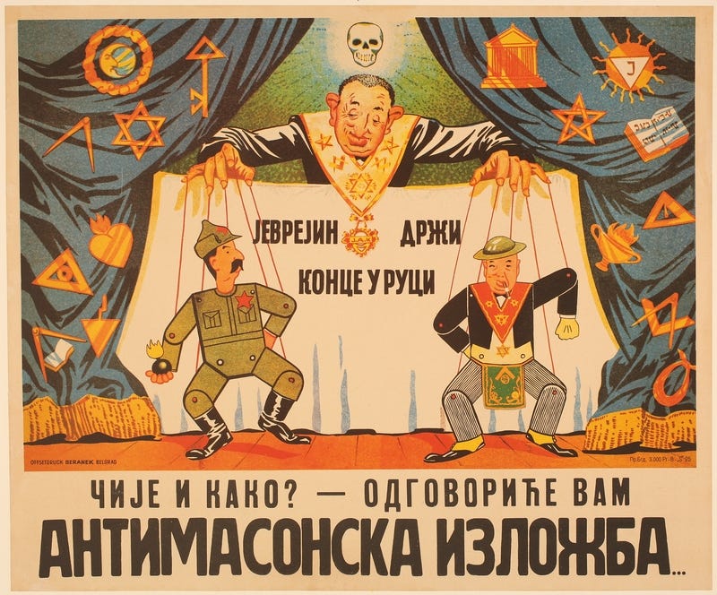 This poster, from German-occupied Serbia circa 1941, “depicts a smirking Jewish puppeteer operating marionettes resembling Stalin and Churchill.” It was part of the Grand Anti-Masonic Exhibition in Belgrade from Oct. 22, 1941, to Jan. 19, 1942, which “focused on the alleged Jewish-Communist-Masonic conspiracy to achieve world domination with the intent to increase hatred against outsider groups that opposed Nazi Germany.” Credit: United States Holocaust Memorial Museum Collection, Gift of the Katz Family