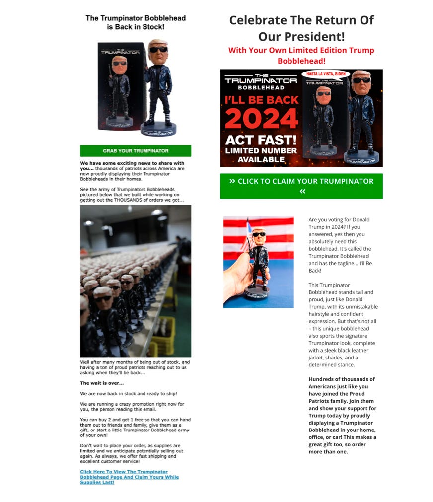 Take the product being hawked here — a bobble head doll that merges Trump and Arnold Schwarzenegger’s Terminator character, in militaristic leathers and dark sun glasses. It’s meant as a play on two Schwarzenegger catch phrases: “I’ll be back,” i.e., as in I’ll be back in the White House, and “haste la vista, baby,” which is recast as “haste la vista, Biden.”